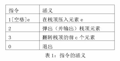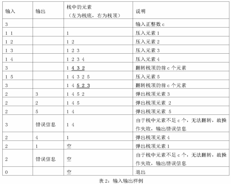 程序期望的实现效果如以下两表所示。其中,输入的第一行是正整数 c,之后每行输入都是一条指令。另外,如遇弹出操作时栈为空,或翻转操作时栈中元素不足 c 个,应当输出相应的错误信息。