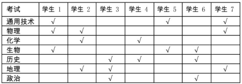 某中学在安排期末考试时发现,有 7 个学生要参加 7 门课程的考试,下表列出了哪些学生参加哪些考试(用√表示要参加相应的考试)。 最少要安排_____个不同的考试时间段才能避免冲突?