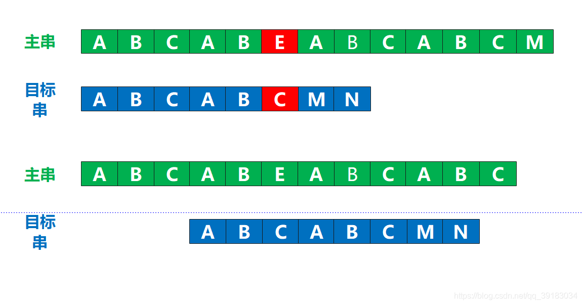 上面的这种暴力匹配是可行的,但是时间复杂度一看就很高,暴力匹配的缺陷所在——回溯太过频繁了。只要出现不匹配就需要回溯到下一位。而KMP算法是为了解决 “如何在主串中快速找到目标串”而孕育出来的算法。