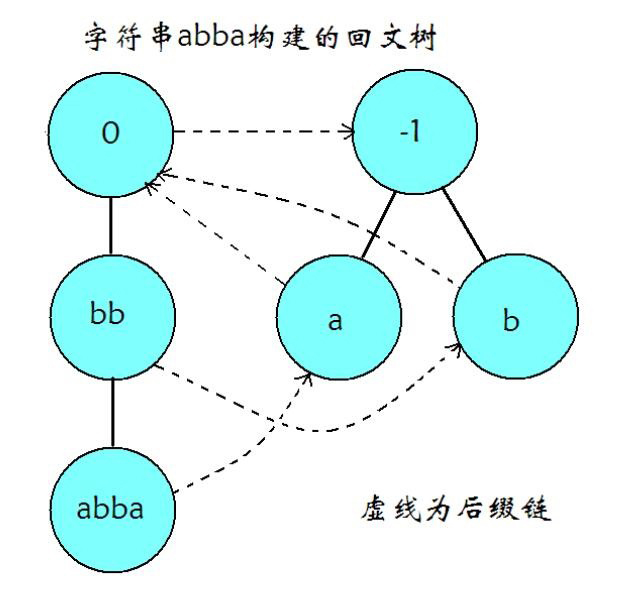 0,1 号节点均不代表串,常数大于 manacher。初始化 fail [0]=fail [1]=1,len [1]=-1,tot=1,last=0。