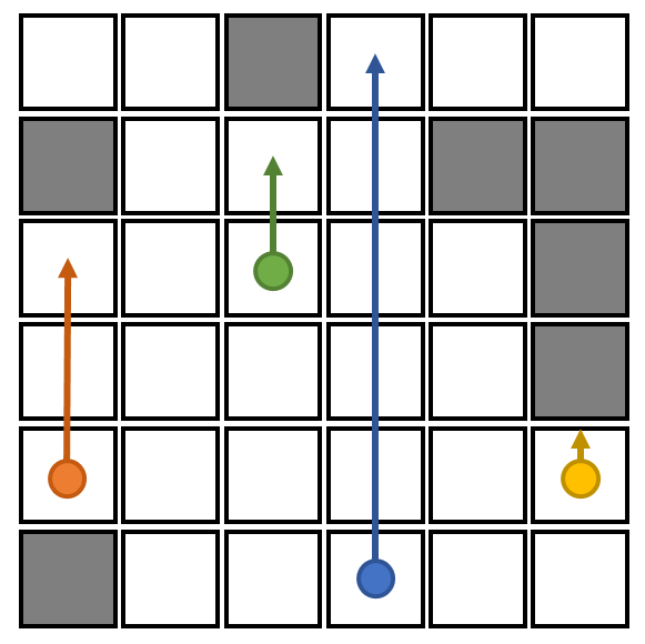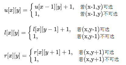 分别表示从某格出发向上、左、右最多能走多少格(包括自身),则: