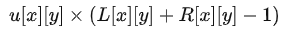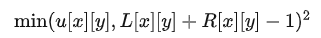 然后我们定义 L、R 分别表示从当前格向上的悬线最多能向左、向右拓展多少格,则: