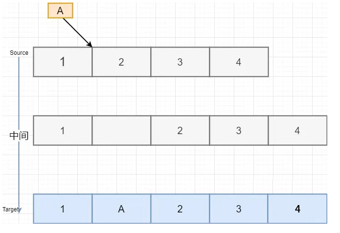 1. 将第1个元素后的整体元素后移,形成新的数组{1,2,2,3,4}