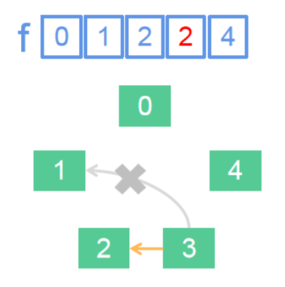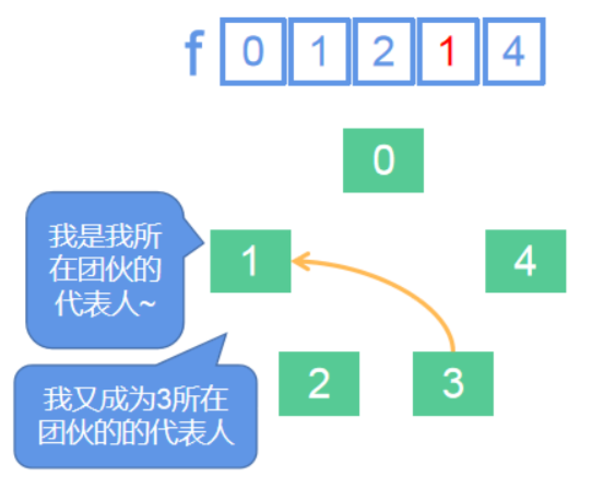 下面我们换一个例子:合并3和4。此时我们不应该令f[3] =4,应该让f[3的团伙代表人] = (4的团伙代表人),如下图。