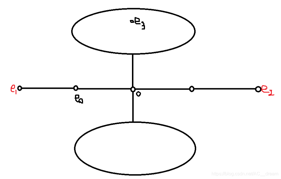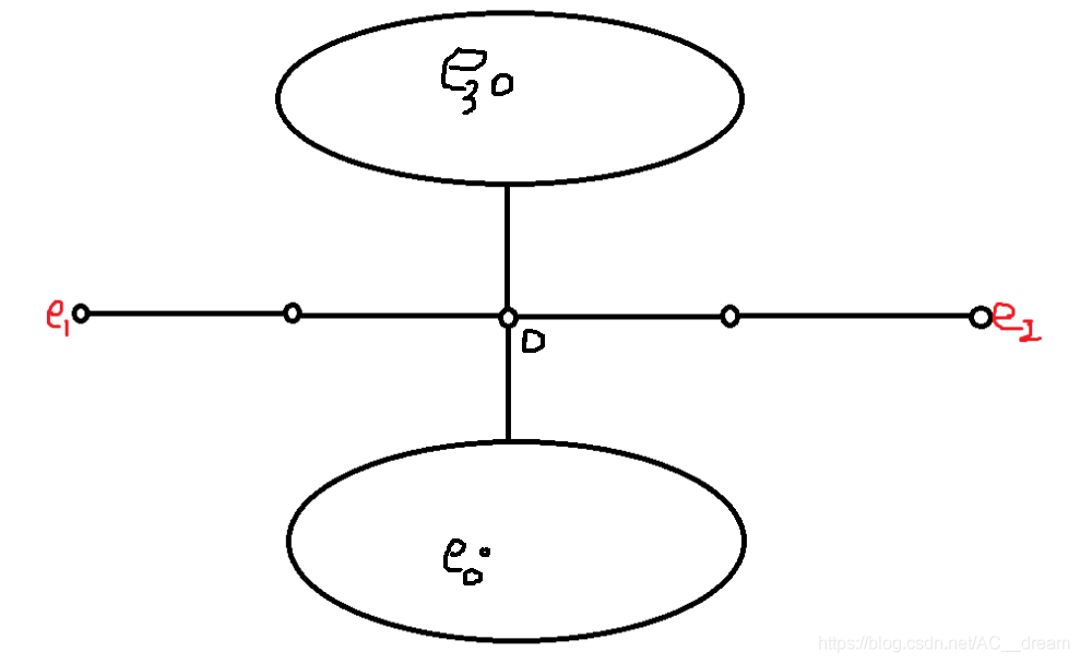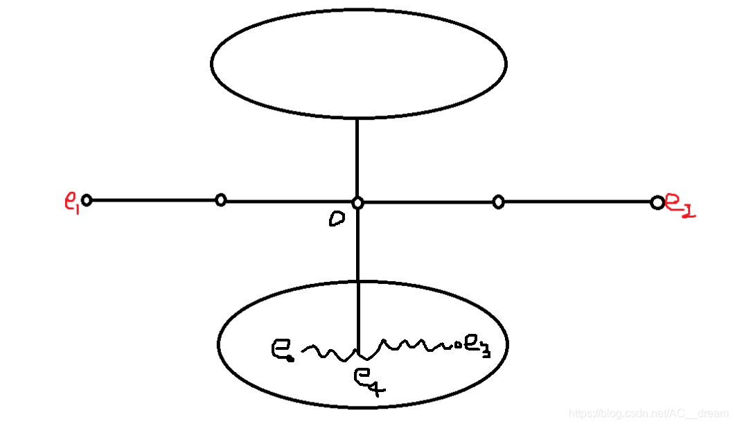 第二种情况:我们一开始所选取的点不在直径上,且e0与e3与直径不相交,设直径上的o点与e0,e3路径上的e4点相交