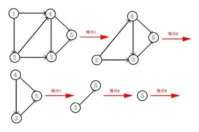 重复 1 和 2 直到当前的 DAG 图为空或当前图中不存在无前驱的顶点为止。后一种情况说明有向图中必然存在环。