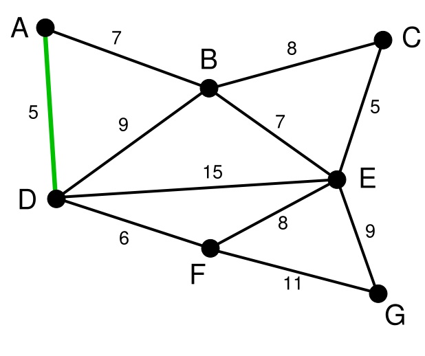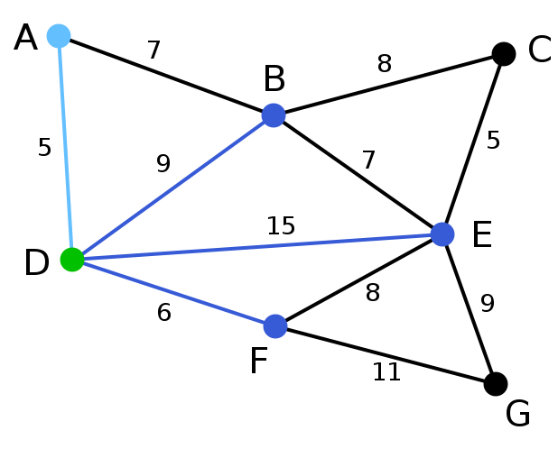 ![]() | 顶点D被任意选为起始点。顶点A、B、E和F通过单条边与D相连。A是距离D最近的顶点,因此将A及对应边AD以高亮表示。 | C, G | A, B, E, F | D |