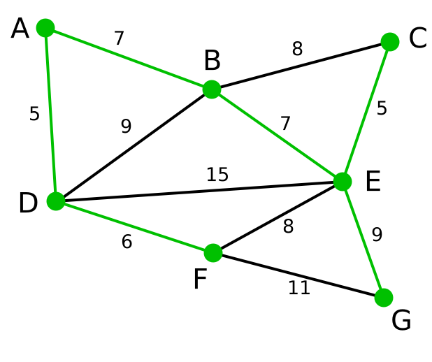 ![]() | 现在,所有顶点均已被选取,图中绿色部分即为连通图的最小生成树。在此例中,最小生成树的权值之和为39。 | 无 | 无 | A, D, F, B, E, C, G |