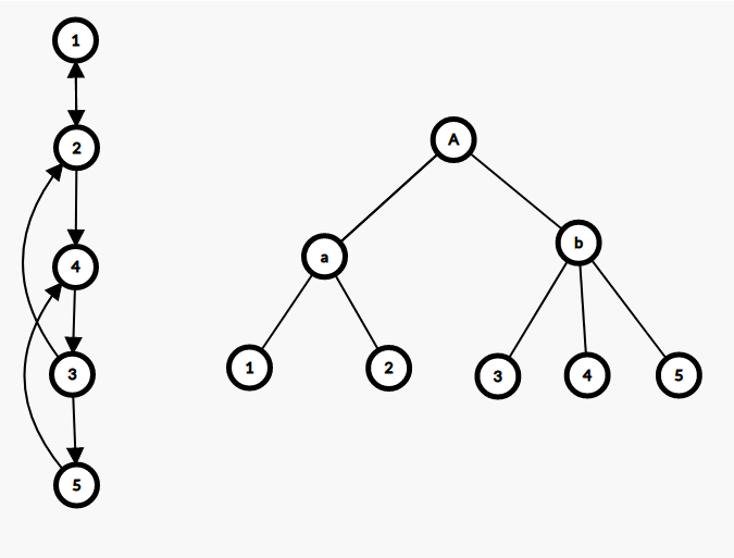 以图片为例,左边的强连通图在收缩后就形成了右边的一棵收缩树,其中 a 是结点 1 与结点 2 收缩后的超级结点,b 是结点 3,结点 4,结点 5 收缩后的超级结点,A是两个超级结点 a 与 b 收缩后形成的。