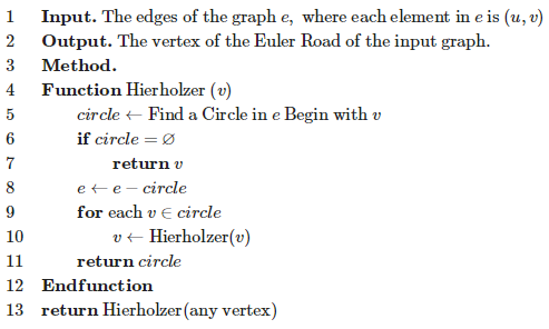 算法流程为从一条回路开始,每次任取一条目前回路中的点,将其替换为一条简单回路,以此寻找到一条欧拉回路。如果从路开始的话,就可以寻找到一条欧拉路。