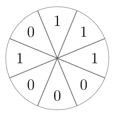 个扇形的圆盘,每个圆盘上放一个字母,使得圆盘上每连续 n 位对应长为 n 的符号串。转动一周(