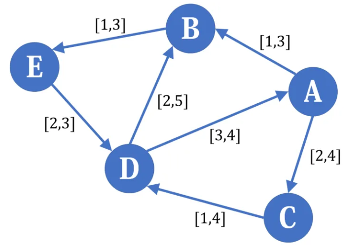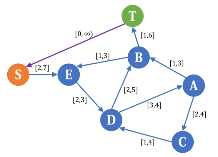 这是上下界网络流中最简单的一种,给定一个没有源点和汇点、每条边的流量有上下界的流量网络,问是否存在一种可行流使得流量平衡。