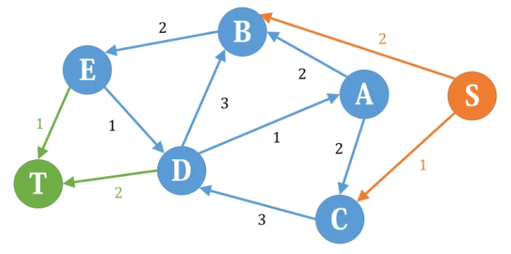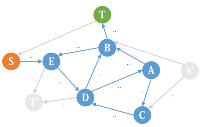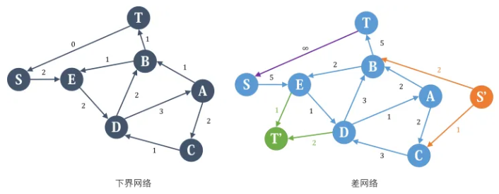 注意,这时候原来的源点和汇点已被处理成普通点,和之后差网络需要额外建立的源、汇点是不同的点,之后如果这两者同时出现,我们记前者为S、T,后者为S′、T′。
