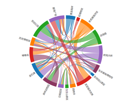 这个图表叫做弦图,弦图主要用于展示多个对象之间的关系,连接圆上任意两点的线段叫做弦,弦(两点之间的连线)就代表着两者之间的关联关系。弦图虽然看起来有点眼花缭乱,但是它却非常适合用户分析复杂数据的关联关系。弦图主要有以下特点: