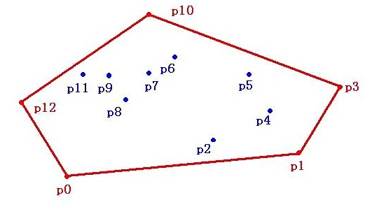 例子:假设平面上有p0~p12共13个点,过某些点作一个多边形,使这个多边形能把所有点都“包”起来。当这个多边形是凸多边形的时候,我们就叫它“凸包”。如下图:
