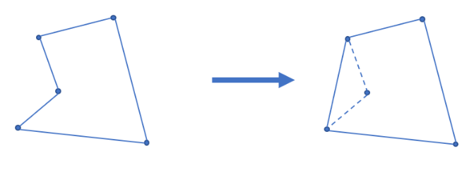 凸包用最小的周长围住了给定的所有点。如果一个凹多边形围住了所有的点,它的周长一定不是最小,如下图。根据三角不等式,凸多边形在周长上一定是最优的。