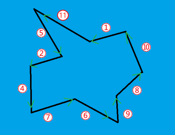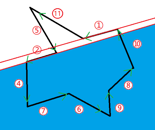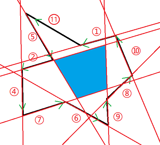 我们可以发现求出来的直线的集合是有序的L={2,5,7,9,11},这些直线刚好是逆时针围着这个半平面交。(这就是按极角排序的好处)。如果要求面积,我们可以把所有L[i] 和L[i+1] 的交点求出来,然后用叉乘求凸包面积。