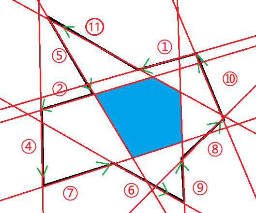 L={2,5,7,9,11} ,如果至少有三条边,就说明该多边形有核(三条以上时,核为全部直线围成的凸包。)如果要求面积,我们可以将直线的交点求出来,然后再用叉积求凸包面积。
