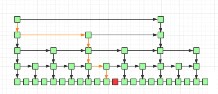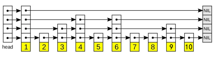 一张跳跃列表的示意图。每个带有箭头的框表示一个指针, 而每行是一个稀疏子序列的链表;底部的编号框(黄色)表示有序的数据序列。查找从顶部最稀疏的子序列向下进行, 直至需要查找的元素在该层两个相邻的元素中间。