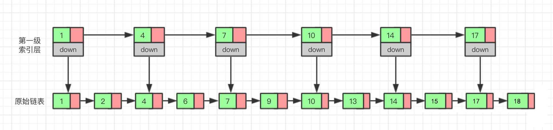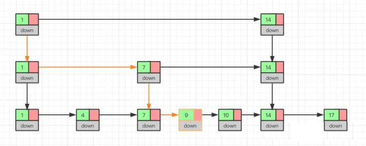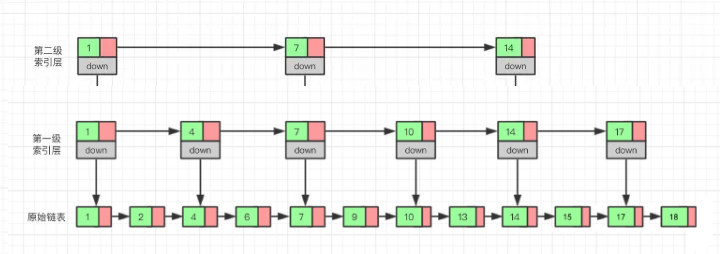 现在如果我们想查找一个数据,比如说 15,我们首先在索引层遍历,当我们遍历到索引层中值为 14 的结点时,我们发现下一个结点的值为 17,所以我们要找的 15 肯定在这两个结点之间。这时我们就通过 14 结点的 down 指针,回到原始链表,然后继续遍历,这个时候我们只需要再遍历两个结点,就能找到我们想要的数据。好我们从头看一下,整个过程我们一共遍历了 7 个结点就找到我们想要的值,如果没有建立索引层,而是用原始链表的话,我们需要遍历 10 个结点。