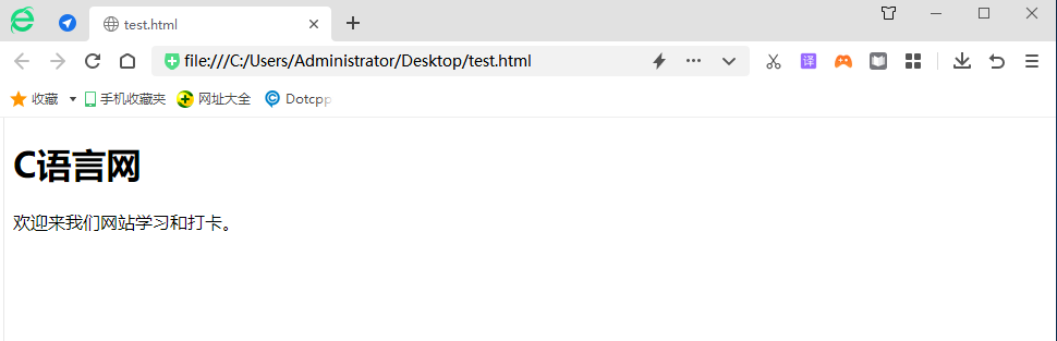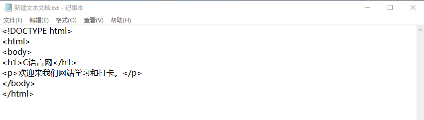 <!DOCTYPE html> <html> <body> <h1>C语言网</h1> <p>欢迎来我们网站学习和打卡。</p> </body> </html>