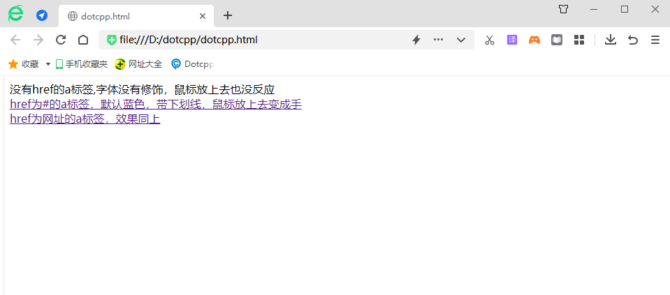 <html> <head> </head> <body > <a>没有href的a标签,字体没有修饰,鼠标放上去也没反应</a> </br> <a href="#" target="_blank"> href为#的a标签,默认蓝色,带下划线,鼠标放上去变成手 </a> </br> <a href="https://www.dotcpp.com/" target="_blank" >href为网址的a标签,效果同上</a> </body> </html>