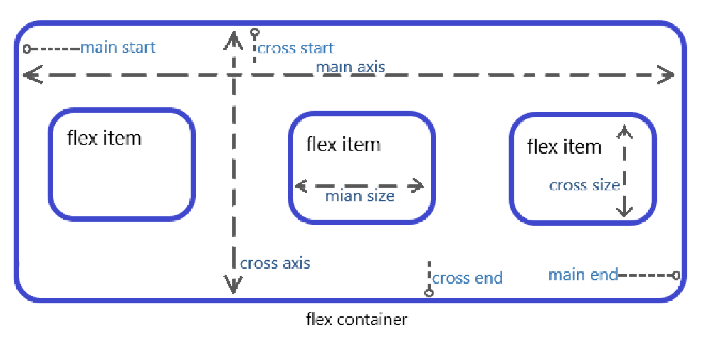 容器默认存在两根主轴:水平的主轴(main axis)和垂直的交叉轴(cross axis),主轴的开始位置(即边框的交叉点)叫做main start,结束位置叫做main end;交叉轴的开始位置叫做cross start,结束位置叫做cross end。项目默认沿主轴排列,单个项目占据的主轴空间叫做main size,占据的交叉轴空间叫做cross size。