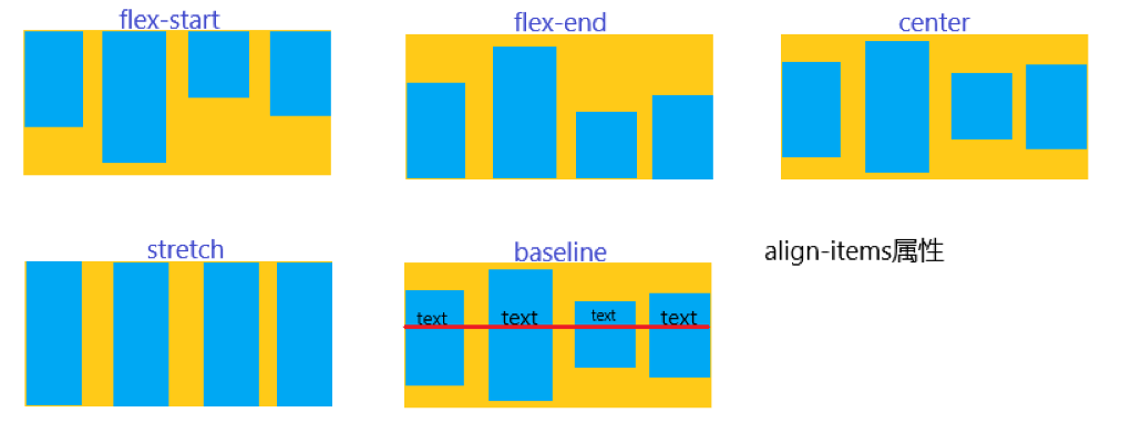 (5)align-items:该属性作用于弹性盒容器,用于控制弹性盒内所有子元素在排列方向的垂直方向上的对齐方式;