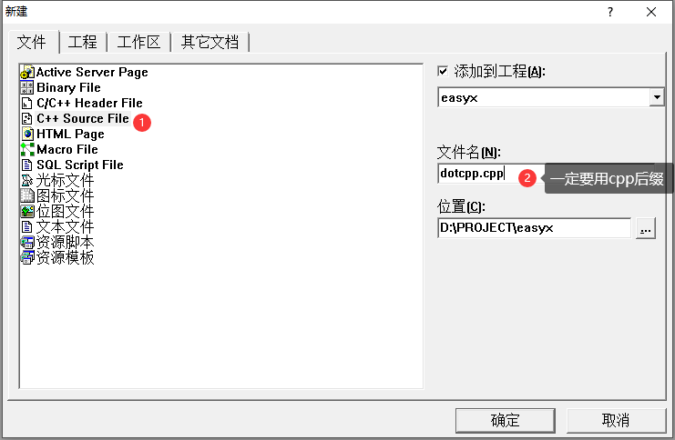 第二步,需要注意的是,源文件的后缀不再像之前那样以.c作为后缀的C程序了,而是.cpp程序,不然编译会报错(大家可以放心,这里虽然是C++程序,但我们的代码依旧是C语言的代码,各位C语言同学不必惊慌~)。