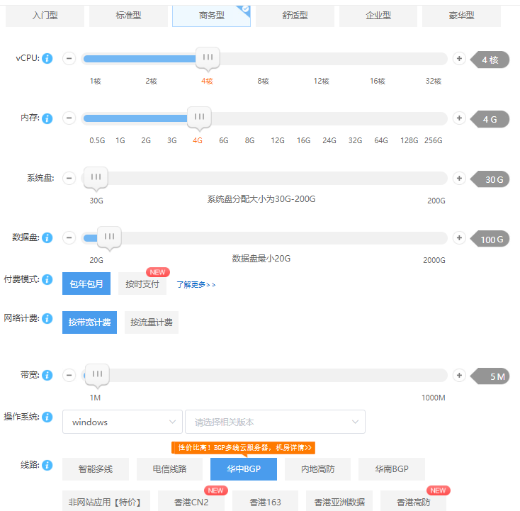 一般而言,虽然windows操作方便,但linux的安全性要比windows高很多,难度也更大,因此本教程将采用Linux系统为主为大家讲解,如下图是某服务器商的云服务器选择配置页面(其他服务商页面不一样但是类似的),我们可以根据需要选择不同的配置: