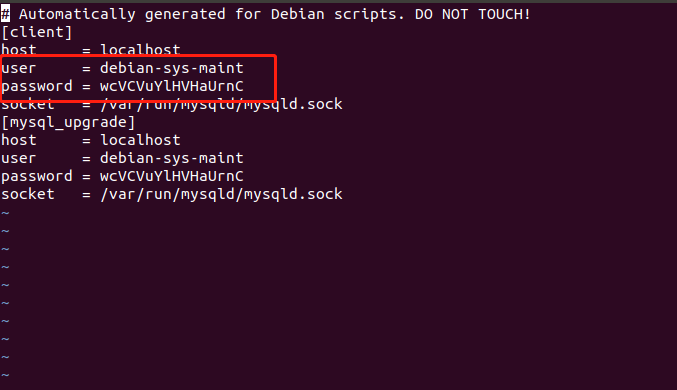 首先,如果是普通用户(root用户可以跳过此步),则需要找到Mysql的保存默认账号密码的文件,位于/etc/mysql下的debian.cnf文件,进入目录然后找到如下信息: