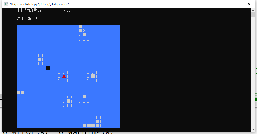其余定义的函数还有检测是否踩雷,计算剩余的雷,判定是否胜利,显示雷,移动光标,做标记。这些函数一般都是用双重循环,或者直接改变变量的方法进行的。这里暂时不给出源码,但完整源码也会有对应的内容。