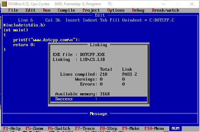 写完之后,按F10,回到菜单通过菜单选择,或者直接编译,按F9,如果没有错误的话会弹出一个编译链接之后的结果,如下图: