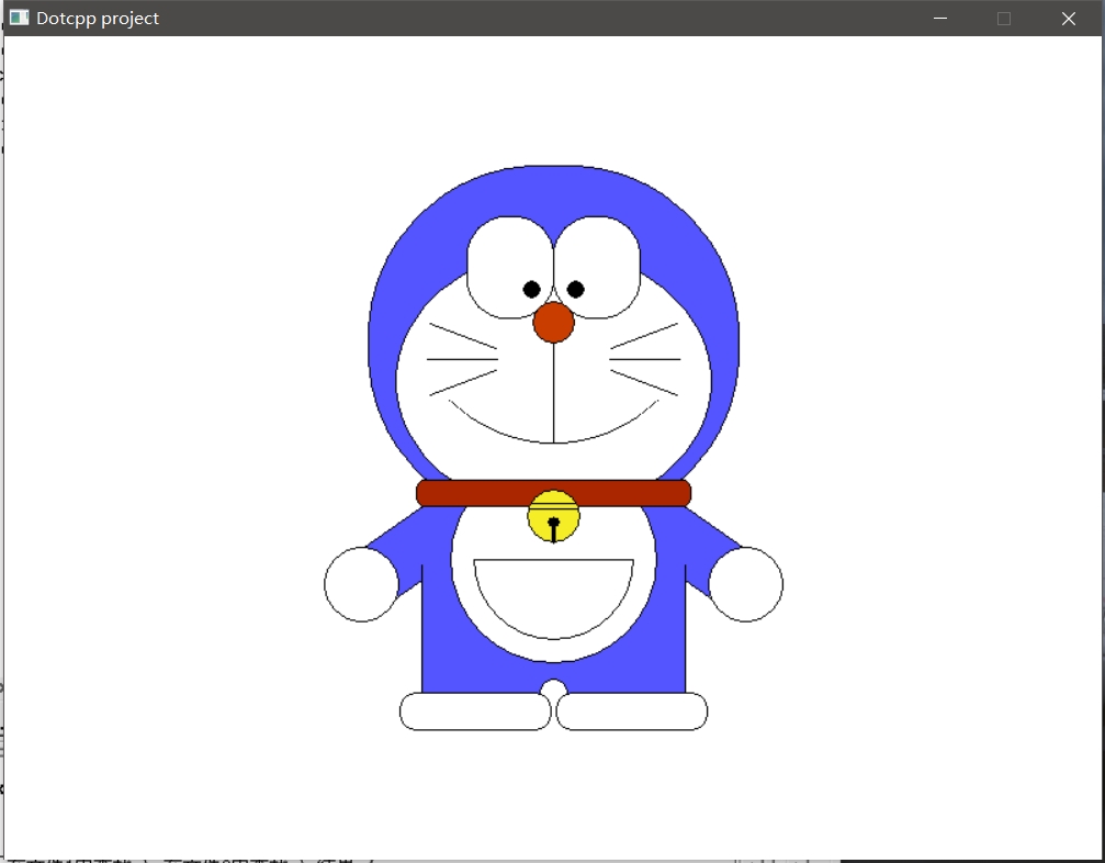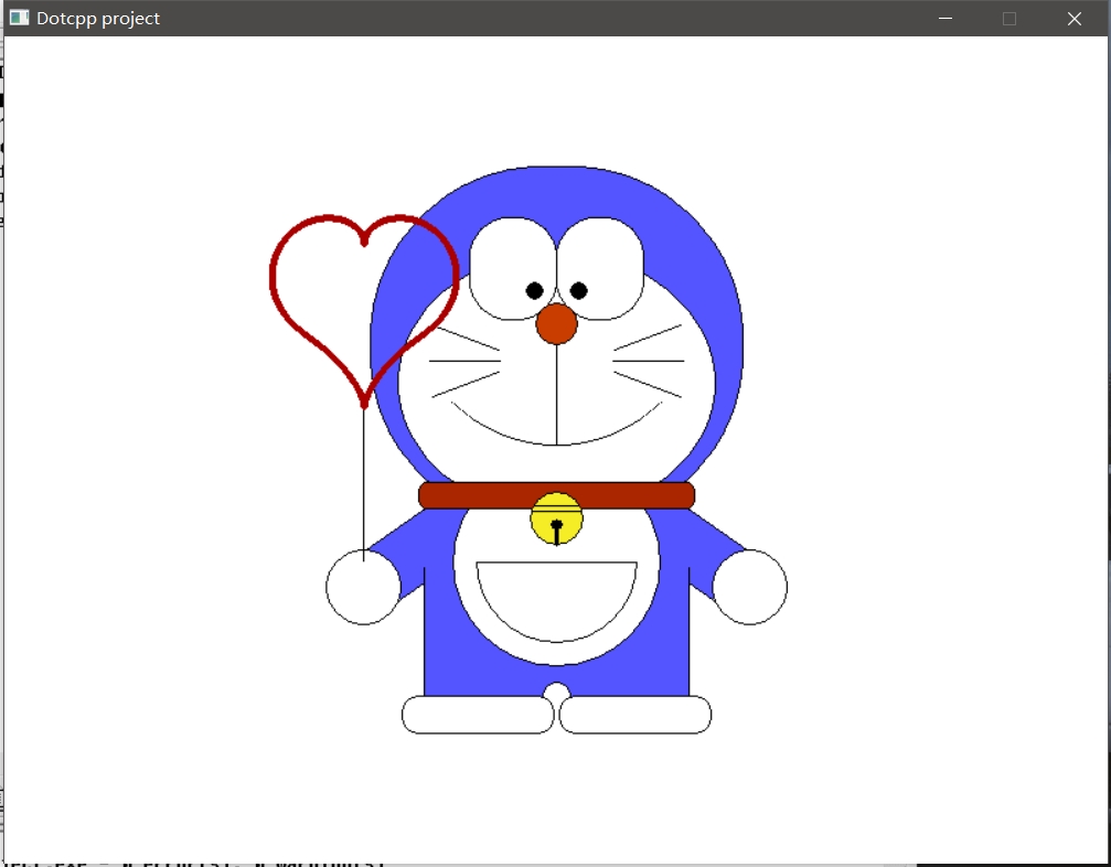 // 画脸 setfillcolor(LIGHTBLUE); // 头 setlinecolor(BLACK); fillroundrect(-135, -206, 135, 54, 248, 248); setfillcolor(WHITE); // 脸 fillellipse(-115, -144, 115, 46); fillroundrect(-63, -169, 0, -95, 56, 56); // 右眼 fillroundrect(0, -169, 63, -95, 56, 56); // 左眼 setfillcolor(BLACK); solidcircle(-16, -116, 6); // 右眼球 solidcircle(16, -116, 6); // 左眼球 setfillcolor(RGB(201, 62, 0)); // 鼻子 fillcircle(0, -92, 15); line(0, -77, 0, -4); // 人中 arc(-108, -220, 108, -4, PI * 5 / 4, PI * 7 / 4); // 嘴 line(-42, -73, -90, -91); // 胡子 line(42, -73, 90, -91); line(-41, -65, -92, -65); line(41, -65, 92, -65); line(-42, -57, -90, -39); line(42, -57, 90, -39); // 画身体 line(-81, 32, -138, 72); // 手臂(上) line(81, 32, 138, 72); line(-96, 96, -116, 110); // 手臂(下) line(96, 96, 116, 110); line(-96, 85, -96, 178); // 腿外侧 line(96, 85, 96, 178); arc(-10, 168, 10, 188, 0, PI); // 腿内侧 setfillcolor(WHITE); // 手 fillcircle(-140, 99, 27); fillcircle(140, 99, 27); fillroundrect(-2, 178, -112, 205, 24, 24); // 脚 fillroundrect(2, 178, 112, 205, 24, 24); setfillcolor(LIGHTBLUE); // 身体填充蓝色 floodfill(0, 100, BLACK); setfillcolor(WHITE); // 肚皮 fillcircle(0, 81, 75); solidrectangle(-60, 4, 60, 24); // 用白色矩形擦掉多余的肚皮 pie(-58, 23, 58, 139, PI, 0); // 口袋 // 画铃铛 setfillcolor(RGB(169, 38, 0)); // 绳子 fillroundrect(-100, 23, 100, 42, 12, 12); setfillcolor(RGB(245, 237, 38)); // 铃铛外形 fillcircle(0, 49, 19); setfillcolor(BLACK); // 铃铛上的洞 solidellipse(-4, 50, 4, 57); setlinestyle(PS_SOLID, 3); line(0, 57, 0, 68); setlinestyle(PS_SOLID, 1); // 铃铛上的纹路 line(-16, 40, 16, 40); line(-18, 44, 18, 44); // 气球 line(-140, 80, -140, -40); // 气球连接线 heart(-140, -150, 30, LIGHTRED); // 心形气球