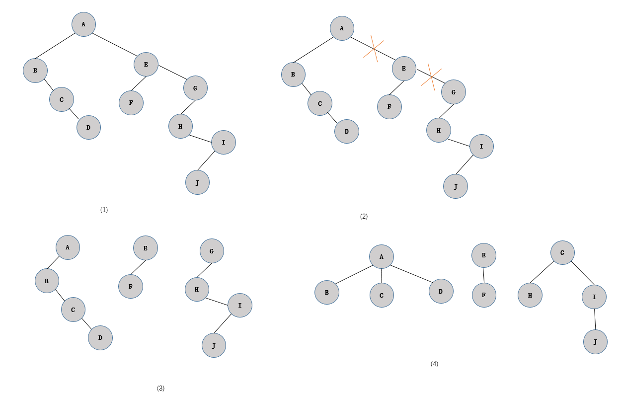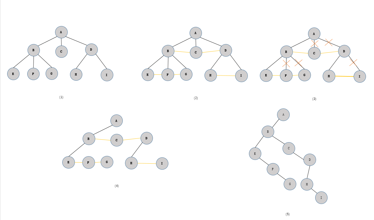 抹线:对每个结点,除了其第一个孩子外,除去其与其余孩子之间的连线