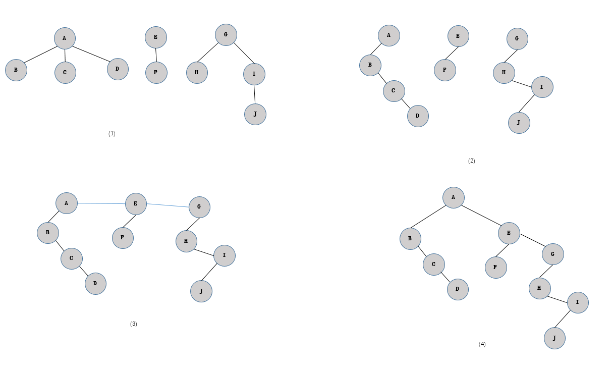 以第一棵树根结点为二叉树的根,再以根结点为轴心,顺时针旋转,构成二叉树型结构