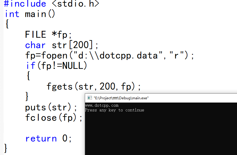 }可以看到,依旧是先fopen打开文件,需要注意的是,注意打开模式要具备读模式,才可以用fgets函数,将文件中的内容读到str里(注意str的空间要足够大)然后通过puts函数输出即可看到效果,假设dotcpp.data文件中有一串字符串:www.dotcpp.com