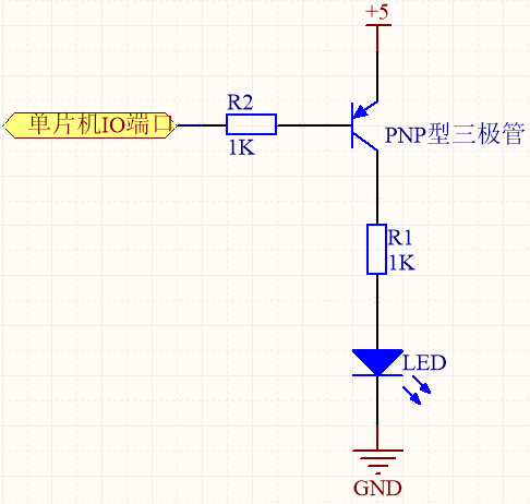 如果单片机IO端口输出的是低电平(0V),此时我们可以直观的认为“+5”那端与单片机IO端口形成压差有电流通过,而电流流向正如箭头所示,则表明此时“+5”与R1是短接状态,三极管导通,灯就被点亮了。