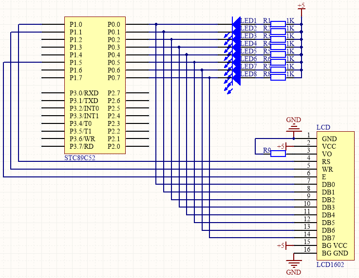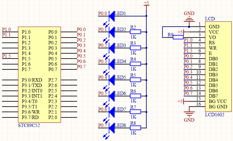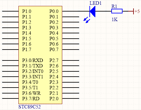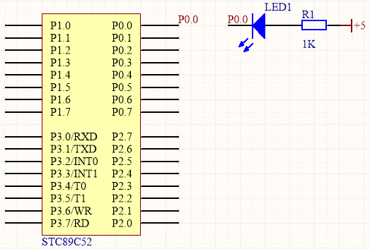 上下两张图都表示同一个连接原理,图一比较直观看到1盏灯直接连上1个IO端口,而图二为了使观赏性更舒适,用两个名字相同的标号(网络标号)放在断点处,表示这两点代表着硬件连接中有一条覆铜线相连。平时阅读原理图我们推荐使用图二,不然用图一模式时元器件连接多了就会感觉太花眼。