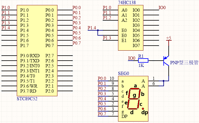 上图是开发板上6个数码管中最右端那个的硬件连接简化图,我们叫它数码管0以好区分。引脚1和6(也就是A A)做为所有内部LED的公共端,此时IO0输出低电平三极管导通,那么这个公共端就接上了5V,而通过P0的8个IO端口中哪几个IO端口输出0数码管中的哪几个段就被点亮。