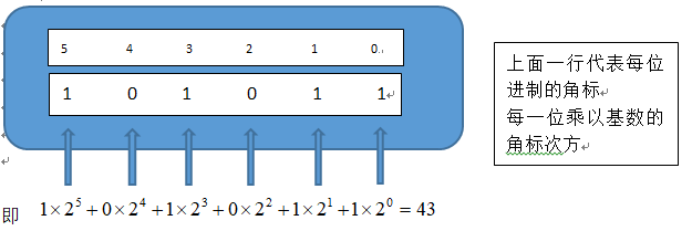 二进制转十进制的方式为每一位乘以基数的角标次方的和,我们举例来说明一下。