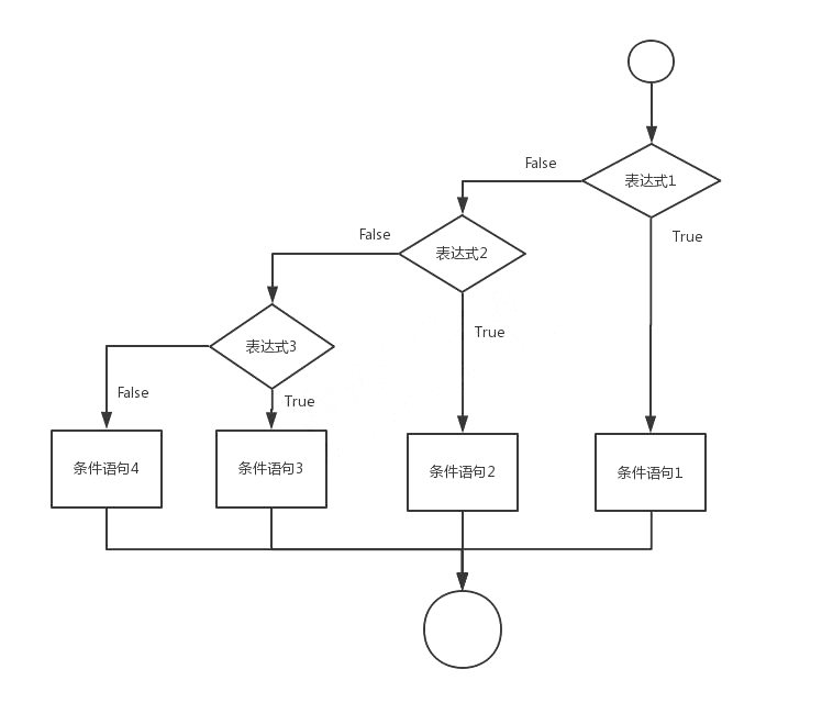 if 表达式1: 条件语句1 elif 表达式2: 条件语句2 elif 表达式3: 条件语句3 else: 条件语句4