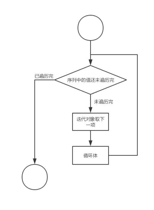 当进入这个循环,首先会判断0-9是否遍历完,如果还未开始,则从第一个开始遍历,第一次是直接进入循环体,然后再次回到判断,判断是否还有值未进入循环,如果存在,就取这一项再次进入循环体,直到序列中的对象全部遍历完,然后退出循环。