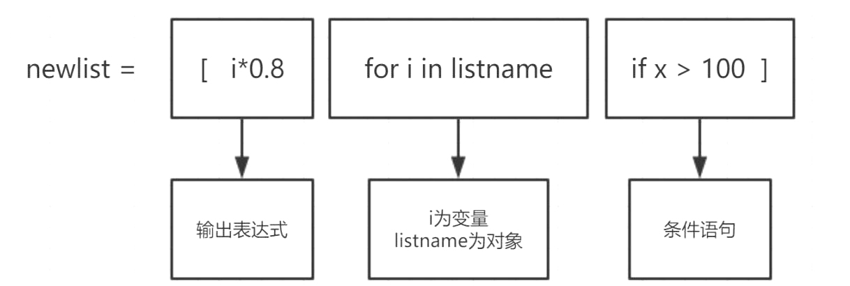 在使用复杂的列表推导式的时候我们可以采用这种方式,可以理解为我们先把符合条件的元素(条件语句)从对象中挑选出来,然后再经过输出表达式的处理,最后存放到了列表当中,形成新的列表。