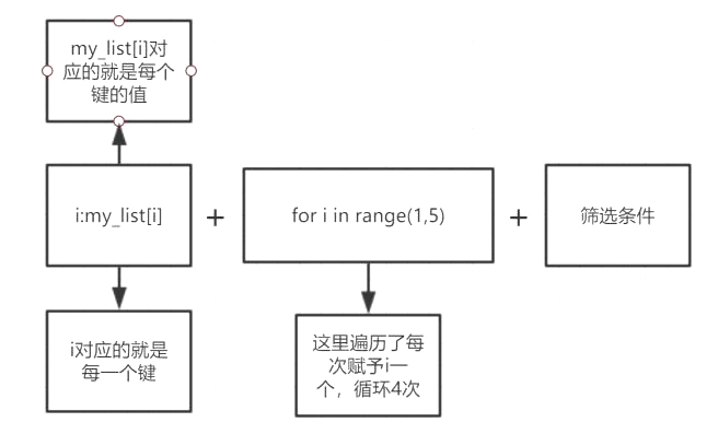 {1: 'dotcpp', 2: 'dotcpp', 3: 'dotcpp', 4: 'dotcpp'}在这里我们来看一下字典推导式的结构,第一部分等同于每一个i的值对象都用‘dotcpp’来赋值,我们也可以先定义一个列表,把列表中的值赋予它。