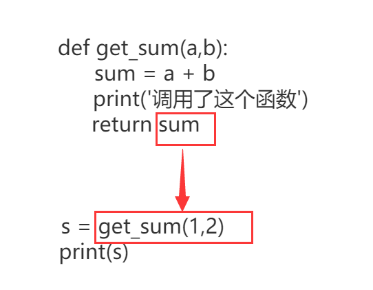 使用这种方式理解一下,在语句s = get_sum(1,2)中,先是调用了这个函数,然后函数顺序往下执行,到了return语句之后,把函数的值等同于sum,然后返回之后后面的语句就不再执行。返回值之后s就可以进行赋值操作,把函数的返回值赋给s,然后输出就可以看到我们的输出结果。