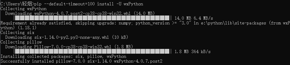 我们在前面介绍了第三方模块的下载方式,在这里我们再介绍一种新的下载方式,如果我们仅仅使用pip install wxPython可能会出现读取超时的现象,所以我们可以使用下面方式进行下载。