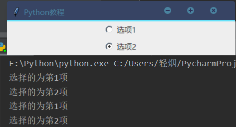 我们每点击一个选项,就选择了该按钮,然后在控制台输出了选择的第几项,需要注意的是我们在定义的时候给两个Radiobutton使用了同一变量,通过这个我们才可以使得两个按钮公用的为一个信息,当然我们还可以通过具体函数去实现更多的功能,在这里先对Radiobutton做一个简单的了解。