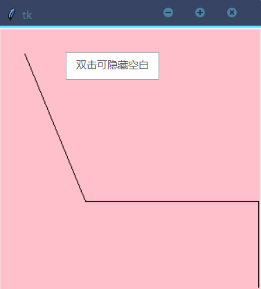 import tkinter class TK: def __init__(self): self.window = tkinter.Tk() self.canvas = tkinter.Canvas(self.window,width = 300,height = 300,bg = 'pink') self.canvas.create_line(30,30,100,200,200,200,300,200,300,300) self.canvas.pack() tkinter.mainloop() m = TK()