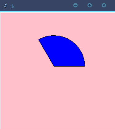 import tkinter class TK: def __init__(self): self.window = tkinter.Tk() self.canvas = tkinter.Canvas(self.window,width = 300,height = 300,bg = 'pink') self.canvas.create_arc(60,60,220,220,start =0,extent = 120,fill ='blue') self.canvas.pack() tkinter.mainloop() m = TK()